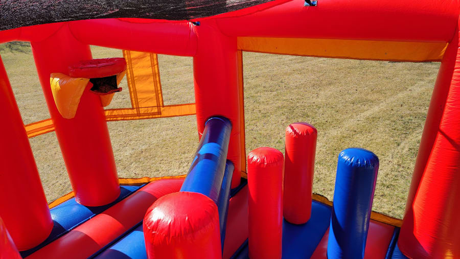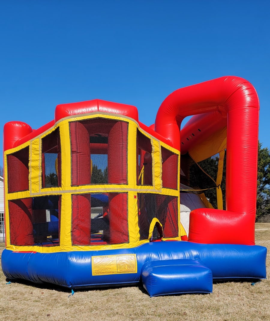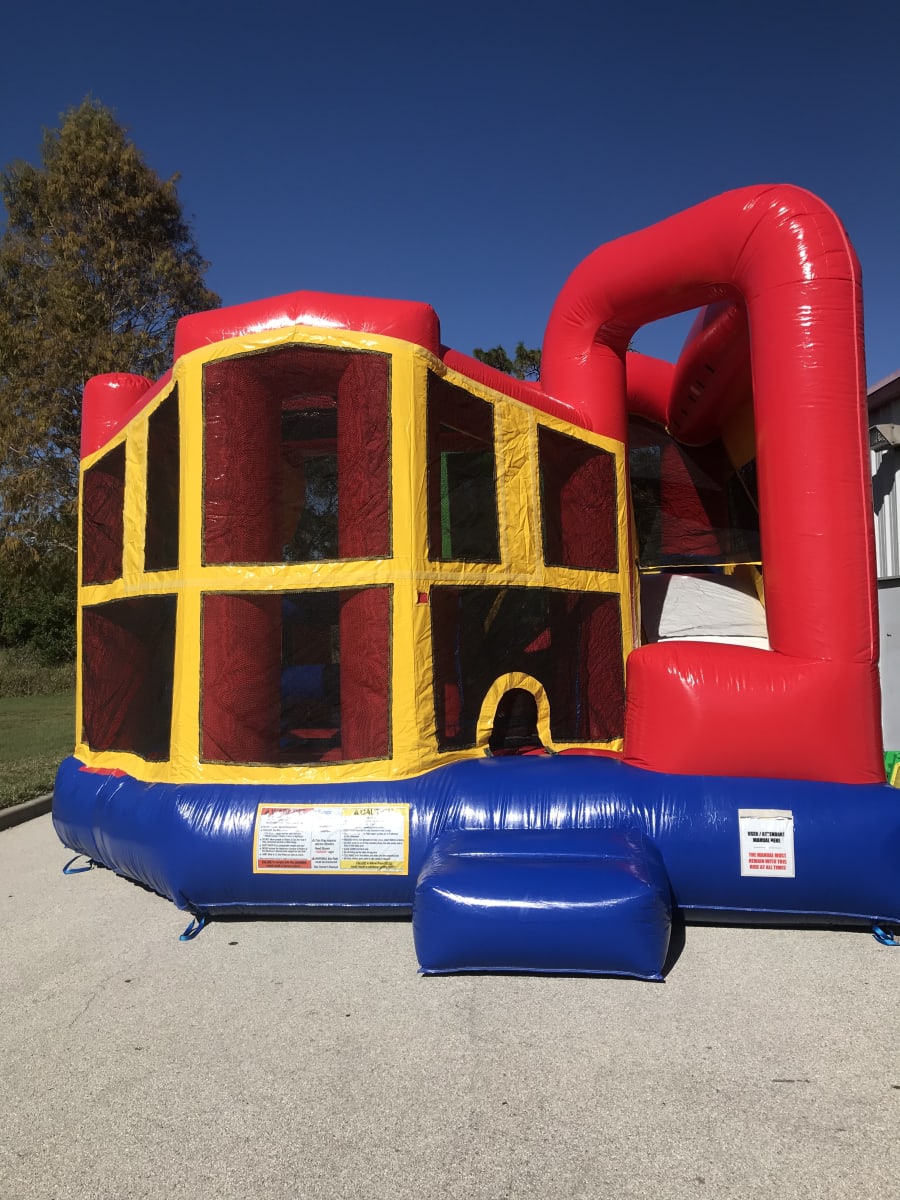 This Bouncy House Obstacle Combo is one of our most popular units. It comes with reinforced seams and a decent bouncing area it's suitable for up to 7-10 kids at a time. The inside features a basket ball hoop inside and an obstacle course with a slide.