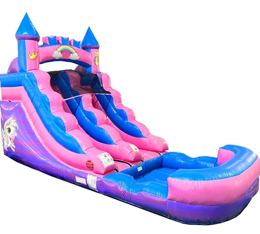 The Pink Unicorn slide is perfect for your little princess and her unicorn fantasies and it can be used as a dry slide and water slide! This slide is a single drop slide and is suitable for up to 2 kids.
